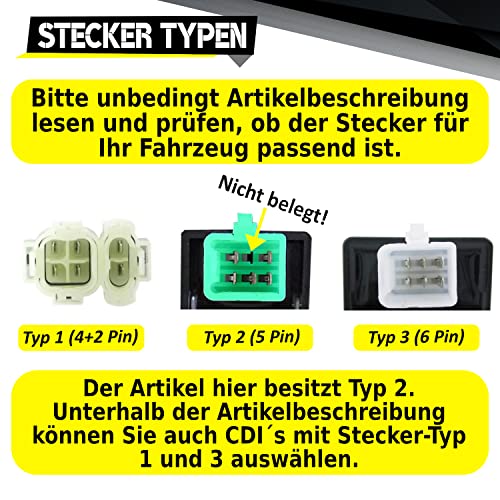 IMPORTANTE: questa centralina CDI funziona solo su modelli con motore da 50 cc a 4 tempi. Si prega di confrontare il connettore con l'immagine, poiché le centraline CDI di alcuni modelli sono state realizzate diverse. I connettori devono essere identici. (Spina semplice con 5 pin, Attenzione esiste anche un'altra versione con 6 pin. Il vostro veicolo deve avere 5)