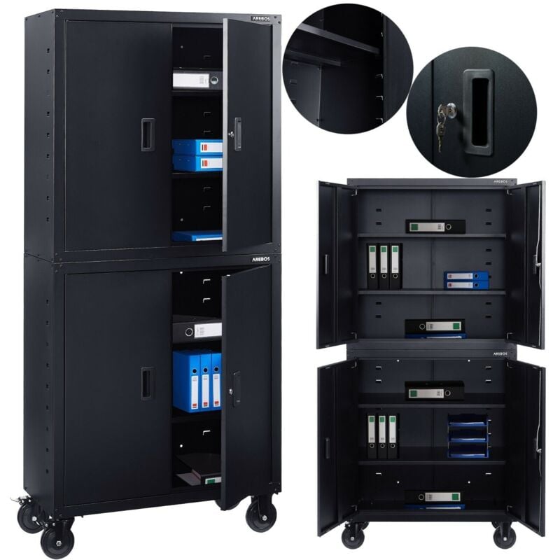 I vantaggi in sintesi: Questo armadio è dotato di quattro rotelle, due delle quali bloccabili. 2x armadi di alta qualità - confezione da due - adatti a diverse applicazioni come per l'uso in officine, magazzini, aziende, uffici, scantinati, spazi abitativi o archivi. I quattro ripiani rimovibili sono ciascuno regolabile in altezza, per una conservazione curata e ordinata. Il prodotto colpisce per il design sempre attuale, capace di adattarsi a qualsiasi ambiente. Perfetto per archiviare file e forniture per ufficio. Classificatore chiudibile a chiave con serratura di sicurezza a cilindro e due coppie di chiavi. Dotato di distribuzione uniforme del carico, ogni ripiano può reggere fino a 40kg di peso. Polvere, briciole e altra sporcizia possono essere rapidamente rimossi dalle superfici. Installazione semplice e veloce garantita. AREBOS - 2x schedario classificatore 90x40x90cm Questo schedario di dimensioni compatte - ca. 90x40x90cm (LxPxA) - colpisce per la sua fattura solida e