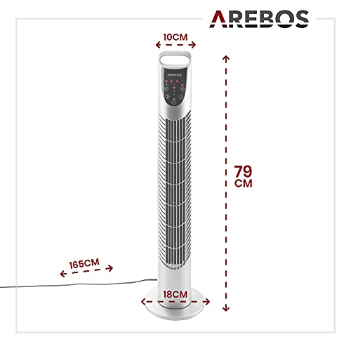 AREBOS Ventilatore a torre con telecomando e timer | 40 Watt | Oscillazione 75° | Ventola con 3 impostazioni di velocità e modalità di sospensione | Approvato TÜV GS | Argento