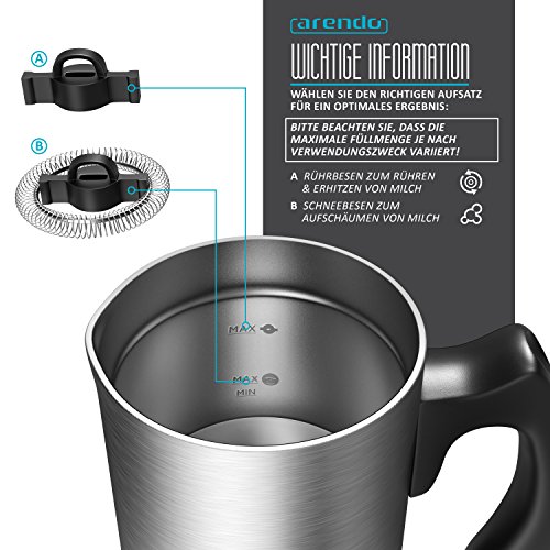 Diametro: 11 cm, altezza: 19 cm, lunghezza (cavo di alimentazione): circa 70 cm | Peso: 690 g (montalatte, 180 g (base) | Materiale: nero - acciaio inossidabile | Contenuto della confezione: montalatte Arendo Milksky + base a 360° con cavo di collegamento + istruzioni (GER, ENG, FRA, ESP, ITA)