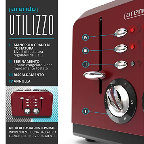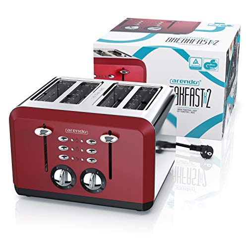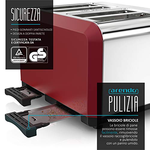 Arendo - Tostapane automatico a 4 fette - Acciaio inox - fino a 4 Toast farciti - 6 Livelli di doratura - funzione Riscaldamento e Scongelamento - 1630 Watt - Rosso - SUPER OFFERTA