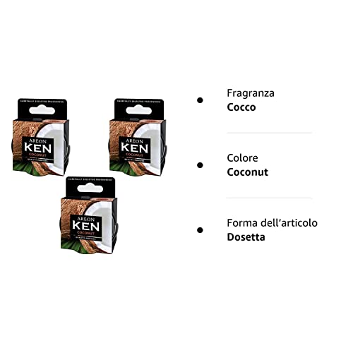 Areon Ken Deodorante Auto Cocco Dolce Tropical Ambiente Profumatore Contenitore Scatola Originale Profumo Interni Casa 3D ( Coconut Set x 3 )
