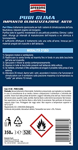Arexons Cura Auto, Puri Clima 350 ml, Trattamento auto per sistemi di climatizzazione, Spray auto igienizzante, detergente e deodorante, Purificante ed elimina odori