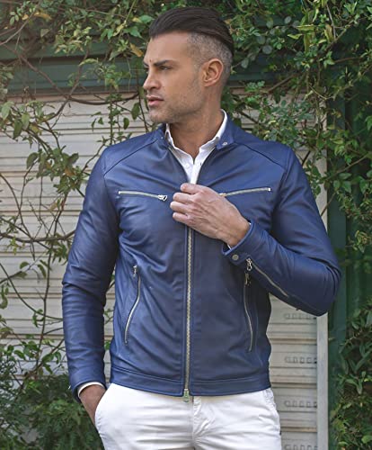 D'Arienzo Giacca in Pelle Blu Uomo Giubbotto Biker Vera Pelle Made in Italy Hamilton 52/Bluette