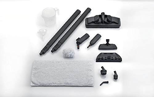 KIT ACCESSORI INCLUSO: tubo prolunga, spazzola, accessorio lavavetri, spazzolino rotondo grande e piccolo, imbuto, misurino, beccuccio 90°, spazzola tessuti con panno cuffia, panno in microfibra per pavimenti