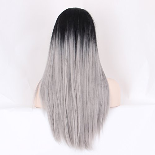 Arimika 26 inch lungo dritto a strati Ombre Grigio Argento Calore Sicuro capelli sintetici Lace Front Wigs Decent Parting spazio marrone medio pizzo nero da 6 - 8 radici