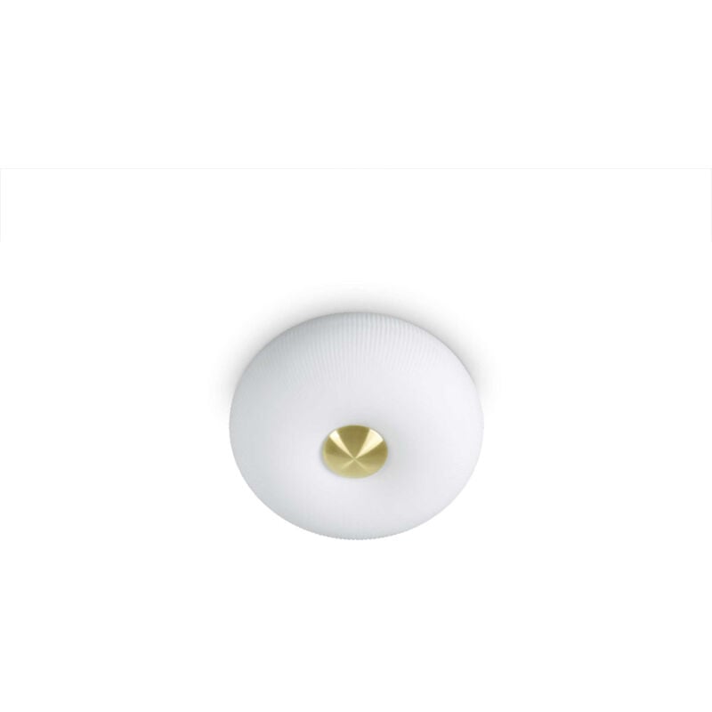Montatura in metallo rifinito in ottone satinato. Diffusore in vetro bianco soffiato, acidato e con rigature decorative in rilievo. Ø 30 x H 18 cm GX53 max 2 x 15W IP:20