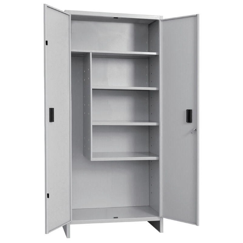 Comodissimo armadio realizzato in metallo, da interno o esterno, ideale per riporre oggetti di casa di grandi dimensioni o scope In lamiera verniciata Completo di una mensola grande e tre piccole Fornito smontato Spessore 6/10 Composto da 4 ripiani regolabili in altezza e da serratura con chiavi in dotazione Specifiche: Altezza: cm 179,5 Larghezza: cm 80 Profondità: cm 40 Peso: 35 kg