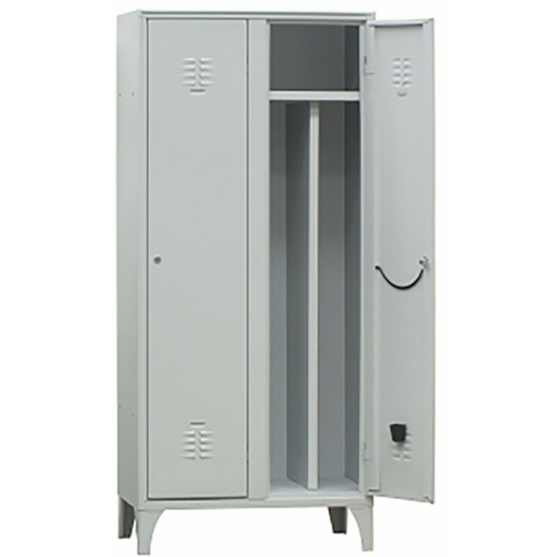 L' armadio spogliatoio su piedi è progettato per offrire una soluzione robusta e funzionale per la gestione degli indumenti in ambienti lavorativi . La struttura portante è realizzata in lamiera d'acciaio profilata di prima scelta, con uno spessore di 6/10 mm, garantendo resistenza e durabilità. Le dimensioni dell'armadio sono 80 cm di larghezza, 50 cm di profondità e 180 cm di altezza. Le ante dell'armadio sono rinforzate e dotate di feritoie di aerazione sia nella parte superiore che in quella inferiore, assicurando una ventilazione adeguata. Le cerniere interne sono speciali antiscasso, mentre il bordo frontale perimetrale arrotondato con un raggio di 6 mm offre una protezione antiurto. Le nervature longitudinali su fianchi e porte contribuiscono a rafforzare ulteriormente la struttura. Ogni vano interno è equipaggiato con una tramezza per separare gli indumenti sporchi da quelli puliti. È presente un ripiano superiore con un tubo ovale porta grucce in PVC, completo di due ganci