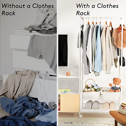 UNHO Armadio Aperto con Ruote, Porta abiti 2 Ripiani Metallo Bianco Appendiabiti da Terra Appendiabiti Scarpiera guardaroba salvaspazio ingresso camera negozio