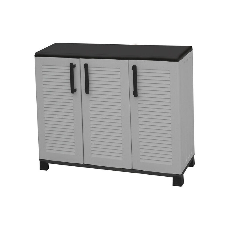 La linea di Aramdi Artplast è realizzata interamente in polipropilene. stampata con presse ad iniezione. Le ante sono fissate alle strutture con cerniere in acciaio che garantiscono una chiusura a scatto. evitando un sistema a sfregamento soggetto ad usura. La struttura e i materiali impiegati rendono questi armadi in polipropilene resistenti alle intemperie. perfetti per l'utilizzo sia in aree aperte. come balconi e cortili. sia in aree chiuse. come cantine. ripostigli e sottoscala. dove maggiormente viene richiesta l'ottimizzazione degli spazi. Mobile basso in polipropilene Realizzato in materiale riciclabile ed eco-sostenibile Con 3 ante e ripiano interno regolabile Resistente alla pioggia Apertura ante fino a 180° Sistema antiusura con cerniere in acciaio che garantiscono una chiusura a scatto Semplice sistema di assemblaggio Lavabile. non assorbe gli odori e non trattiene l'umidità Colore: grigio e nero Dimensioni: 102 x 37 x h90 cm