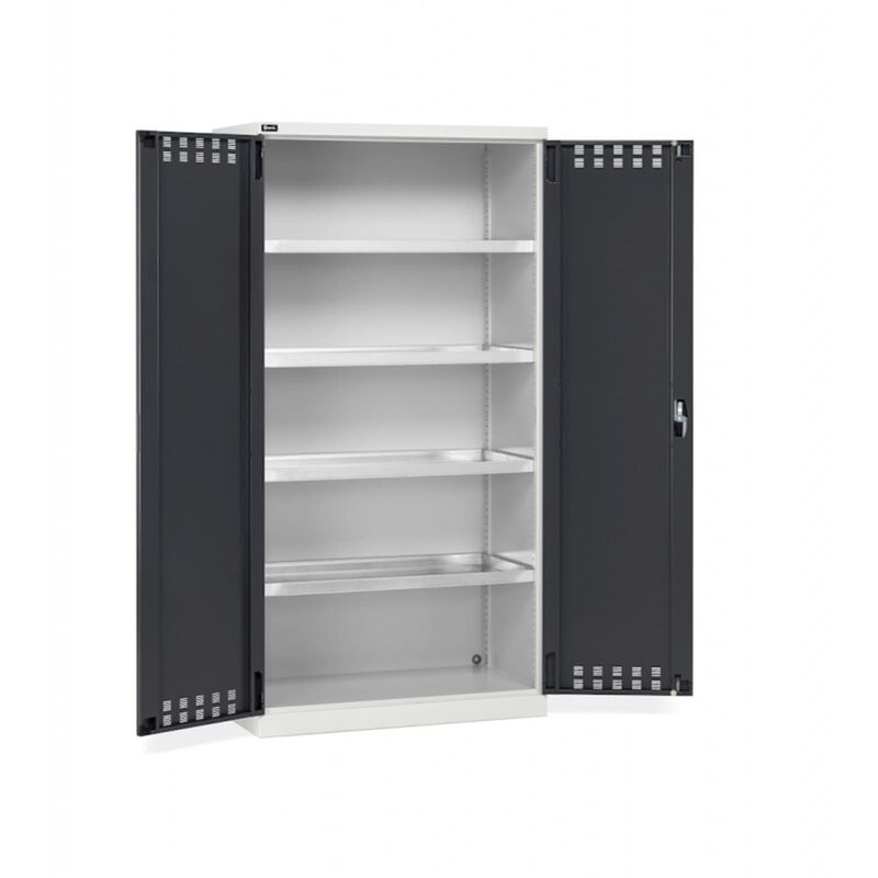 Armadio alto 200 cm particolarmente indicato per lo stoccaggio di liquidi inquinanti e/o pericolosi come vernici, farmaci e prodotti chimici grazie alla presenza di vasche. Le ante sono fessurate per il ricambio dell'aria onde evitare ristagni.