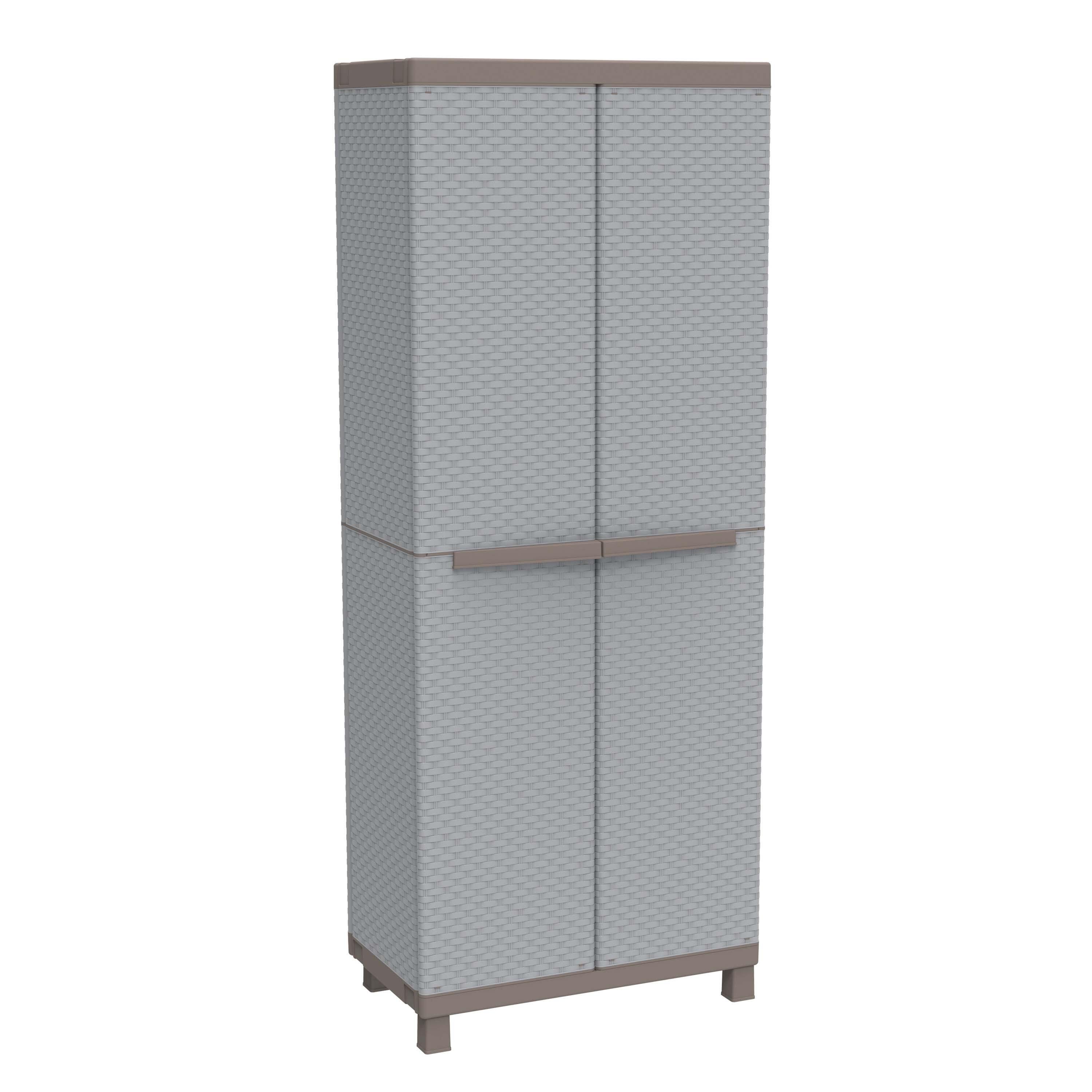 Armadio alto a 2 ante tuttopiani con 3 ripiani interni regolabili. Apertura delle ante a 180° . Dotato di piedini . Possibilità di chiusura con lucchetto (non incluso). Finitura delle ante effetto rattan. Colore grigio/tortora
