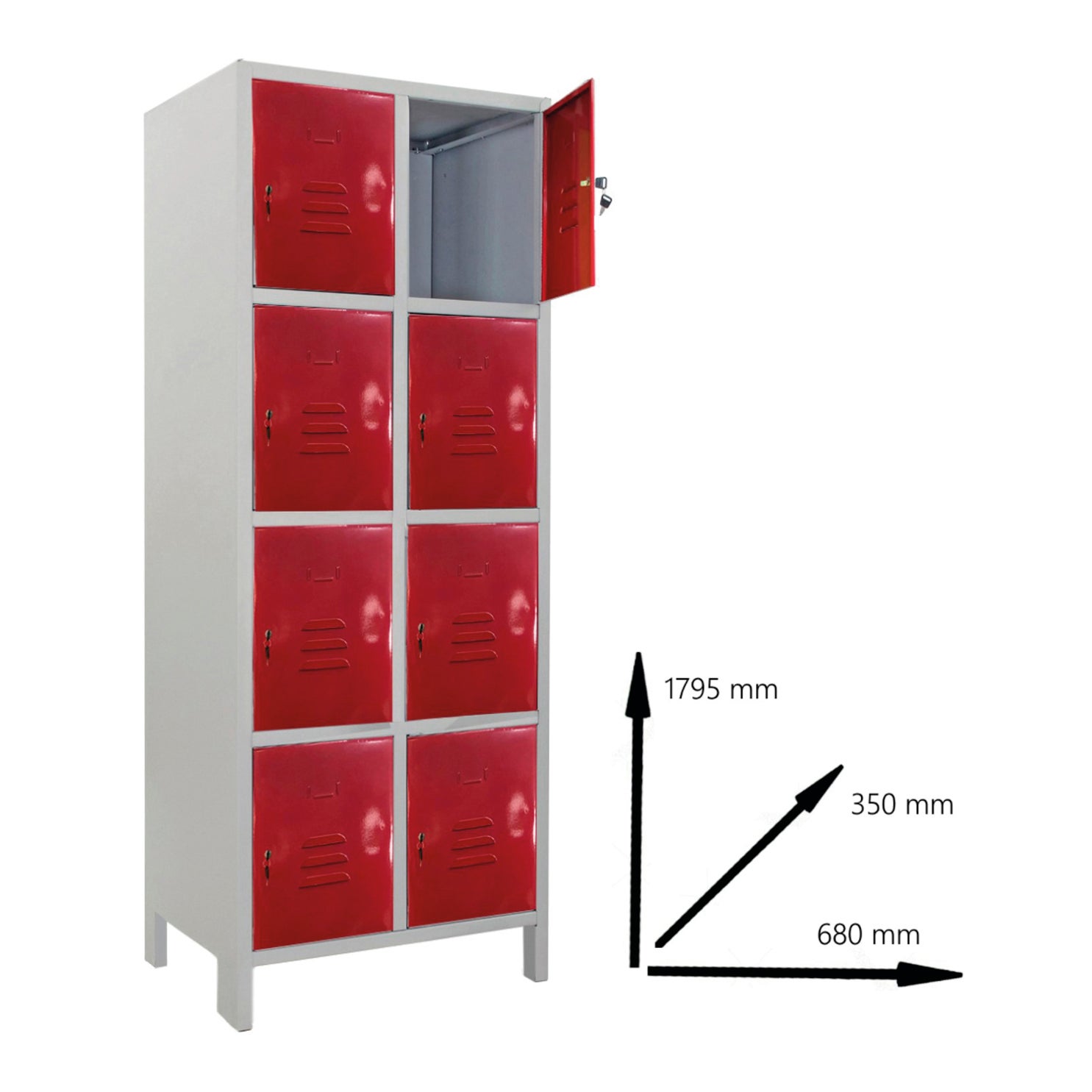 ARMADIO MONOBLOCCO CASELLARIO 8 POSTI ASSEMBLATO CON APPENDIABITI, RIPIANO INTERNO, MANIGLIA LUCCHETTABILE, FERITOIE E PORTA CARTELLINO. COLORE ROSSO RAL 3000 DA ASSEMBLARE. L680xP350xH1795mm