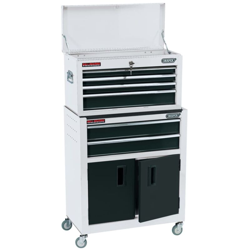 Il pratico armadio a rotelle combinato con cassetta portattrezzi della Draper Tools è indispensabile in ogni officina, in quanto è ideale per riporre vari strumenti e altri dispositivi. Questo robusto armadio per attrezzi con una cassetta con coperchio superiore incernierato e una sezione centrale con 3 cassetti e un bauletto inferiore offre un notevole spazio di stoccaggio. Vi aiuta a mantenere i vostro strumenti in ottimo ordine, aggiungendo così la comodità di un uso futuro. Il bauletto inferiore è abbastanza spazioso da contenere utensili di grandi dimensioni, mentre tutti i cassetti sono perfetti per utensili di piccole dimensioni, dadi e viti. Il meccanismo di chiusura centrale consente di bloccare contemporaneamente tutti i cassetti. Impedisce che si aprano accidentalmente quando il carrello degli attrezzi viene spostato. È realizzato in lamiera d'acciaio con finitura verniciata a polvere e finitura effetto alluminio. I cassetti sono inoltre dotati di guide a sfere per un