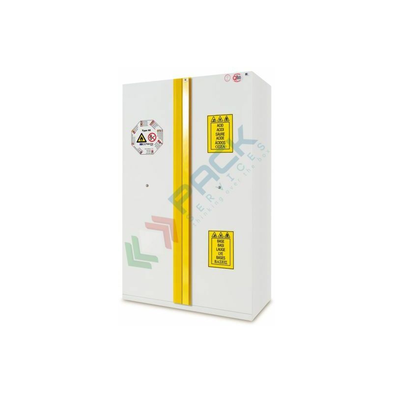 ARMADIO DI SICUREZZA COMBINATO, PER LO STOCCAGGIO DI PRODOTTI CHIMICI ED INFIAMMABILI, TYPE 90 Armadio di sicurezza combinato per lo stoccaggio di prodotti infiammabili, acidi e basi, Mis. esterne 1200 L x 600 P x 1950 H mm, Mis. interne 540 +540 L x 446 P x 1540 H mm (760 + 760 per scomparto acidi/basi). Armadio per lo stoccaggio in sicurezza di prodotti pericolosi con 2 porte e 3 scomparti: SCOMPARTO PER INFIAMMABILI 3 ripiani in acciaio verniciato + 1 vasca di ritenzione con griglia, SCOMPARTO PER ACIDI: 2 ripiani in acciaio verniciato, SCOMPARTO PER BASI: ripiaini in acciaio inox (carico massimo 60 Kg distribuiti uniformemente). Armadio di sicurezza certificato secondo le norme EN 14470-1 e EN 14727. Armadio di sicurezza realizzato in lamiera di acciaio zincato dello spessore di 1 -1,5 mm, piegata a freddo, isolamento degli armadi di sicurezza tramite pannelli di lana di roccia ad alta densità e pannelli di solfato di calcio, finitura interna con pannelli melaminici altamente