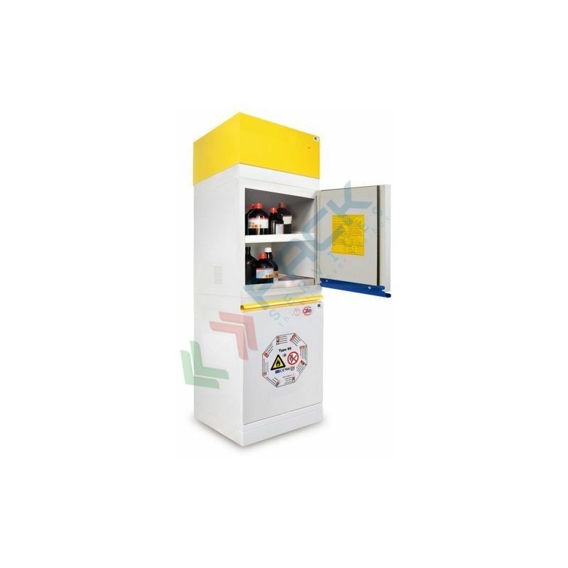 ARMADIO DI SICUREZZA COMBINATO PER LO STOCCAGGIO DI PRODOTTI INFIAMMABILI E CHIMICI, TYPE 90 Armadio di sicurezza combinato per lo stoccaggio di prodotti infiammabili, chimici acidi e basici, con classe di resistenza al fuoco certificata 90 minuti (TYPE 90). Armadio di stoccaggio con Mis. esterne 595 L x 600 P x 1685+300 H mm, 2 comparti con aspirazione. Scomparto ACIDI e BASICI a porta: 1 ripiano in acciaio verniciato + 1 ripiano in acciaio Inox, Mis. 530 L x 430 P x 630 H mm. Scomparto INFIAMMABILI type 90 a porta: vasca e griglia, mis. 483 L x 349 P x 593 H mm. Peso 170 Kg. Armadio di sicurezza realizzato in lamiera di acciaio elettrozincata con spessori di 1;