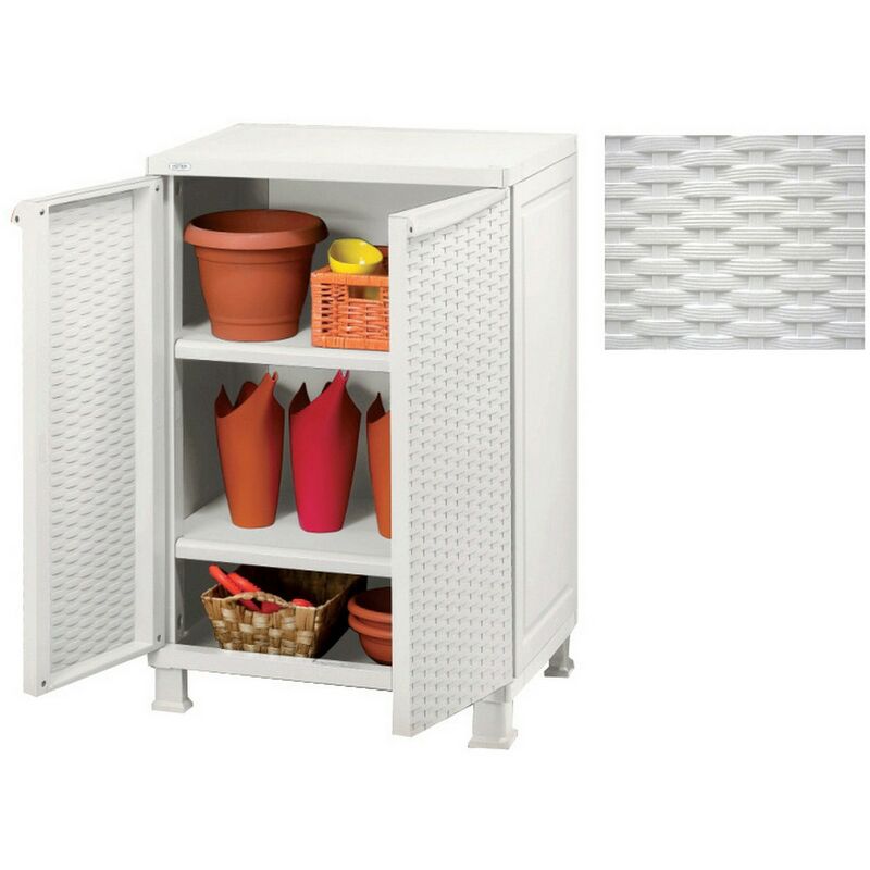 Serie rattan style mod. base in resina antiurto, effetto polirattan. ottima resistenza agli agenti atmosferici. doppia anta, due ripiani interni. dimensioni cm 65x45x98h colore bianco