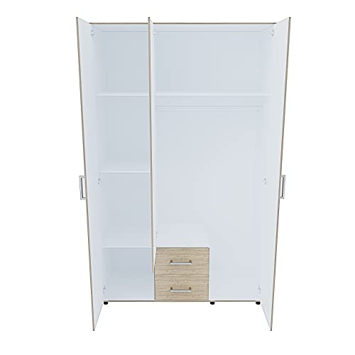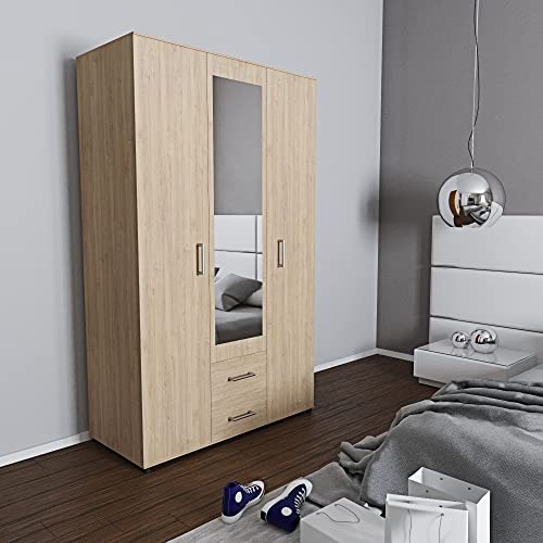 Armadio Guardaroba Con Specchio Armadietto Con 3 Ante e 2 Cassetti Tangeri Con ripiani e Asta Appendi Abiti Mobile Guardaroba Camera Da Letto Salotto Salone Ingresso 195 x 120 x 55 cm Colore Rovere