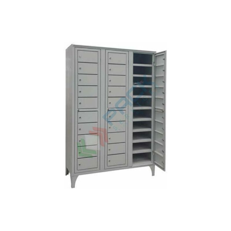 Armadietto casellare ispezionabile metallico a 30 vani, realizzato in lamiera d'acciaio spess. 6/10 con ante rinforzate e dotate di feritoie di aerazione, 4 piedi di appoggio, cerniere interne speciali antiscasso e bordo frontale perimetrale arrotondato anti urto. Dimensioni esterne armadio: larghezza 1200 mm, profondità 500 mm, altezza 1800 mm con maniglia in metallo lucchettabile. Consegnato montato.
