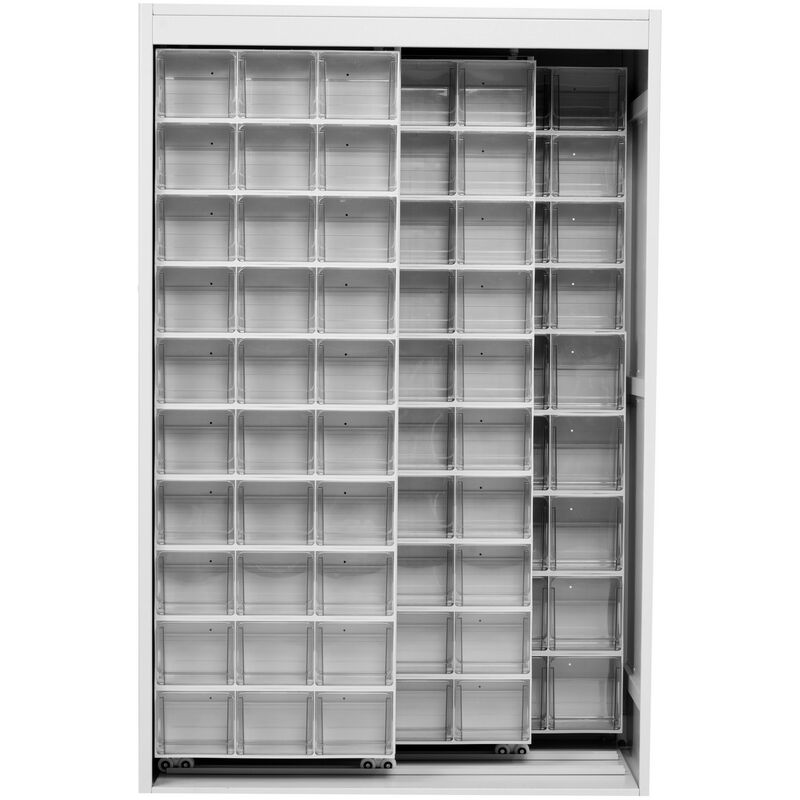 In metallo.a 2 pannelli scorrevoli con 104 cassetti. dimensioni cm 127x60x195h