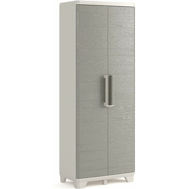 Resina Altezza: 182 cm Colore: Marrone Larghezza: 68 cm Lunghezza: 39 cmWood grain Alto fornisce l'eleganza tipica del legno con design moderno in colorazione grigio chiaro. Resistente ai raggi UV,dotato di chiusura con predisposizione per lucchetto, di maniglie con finitura effetto legno e di 3 ripiani regolabili con una portata massima di 15 Kg ciascuno. Facile da assemblare, Ripiani regolabili, Piedini regolabili, Cerniere in metallo, Ripiani con portata massima di 15 Kg ciascuno, Certificato TUV GS
