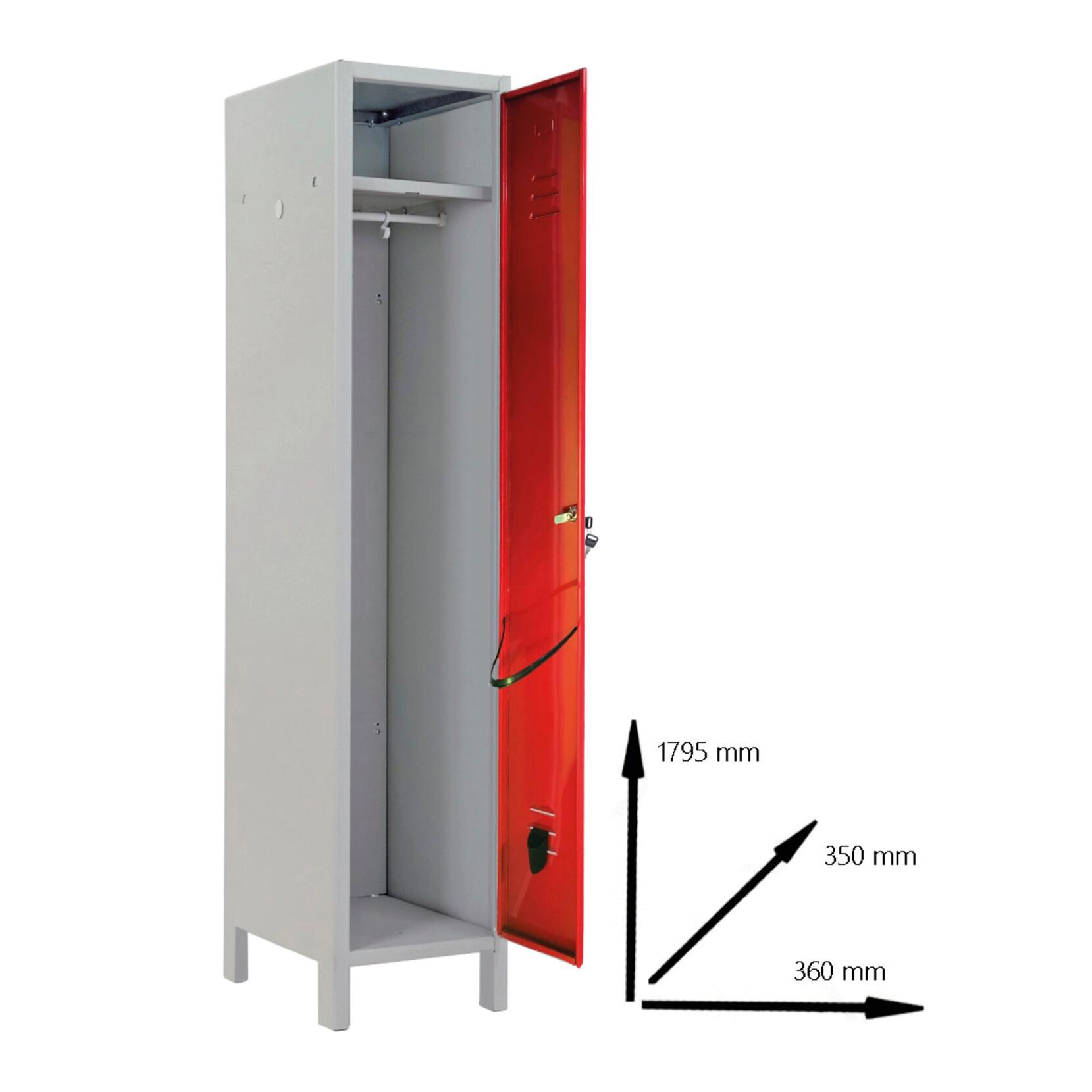 Spogliatoio 1 posto componibile con cerniere interne antiscasso e ripiani antitaglio. Bicchierino porta ombrello e porta asciugamano. RAL 3000. Completo di serratura e piedini in metallo