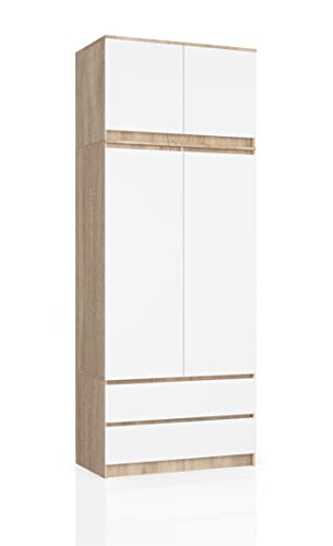 BDW Armadio a 4 ante, 4 ripiani, grucce, 2 cassetti, armadio per camera da letto, soggiorno, corridoio, 234 x 90 x 51 cm, (rovere Sonoma/bianco)