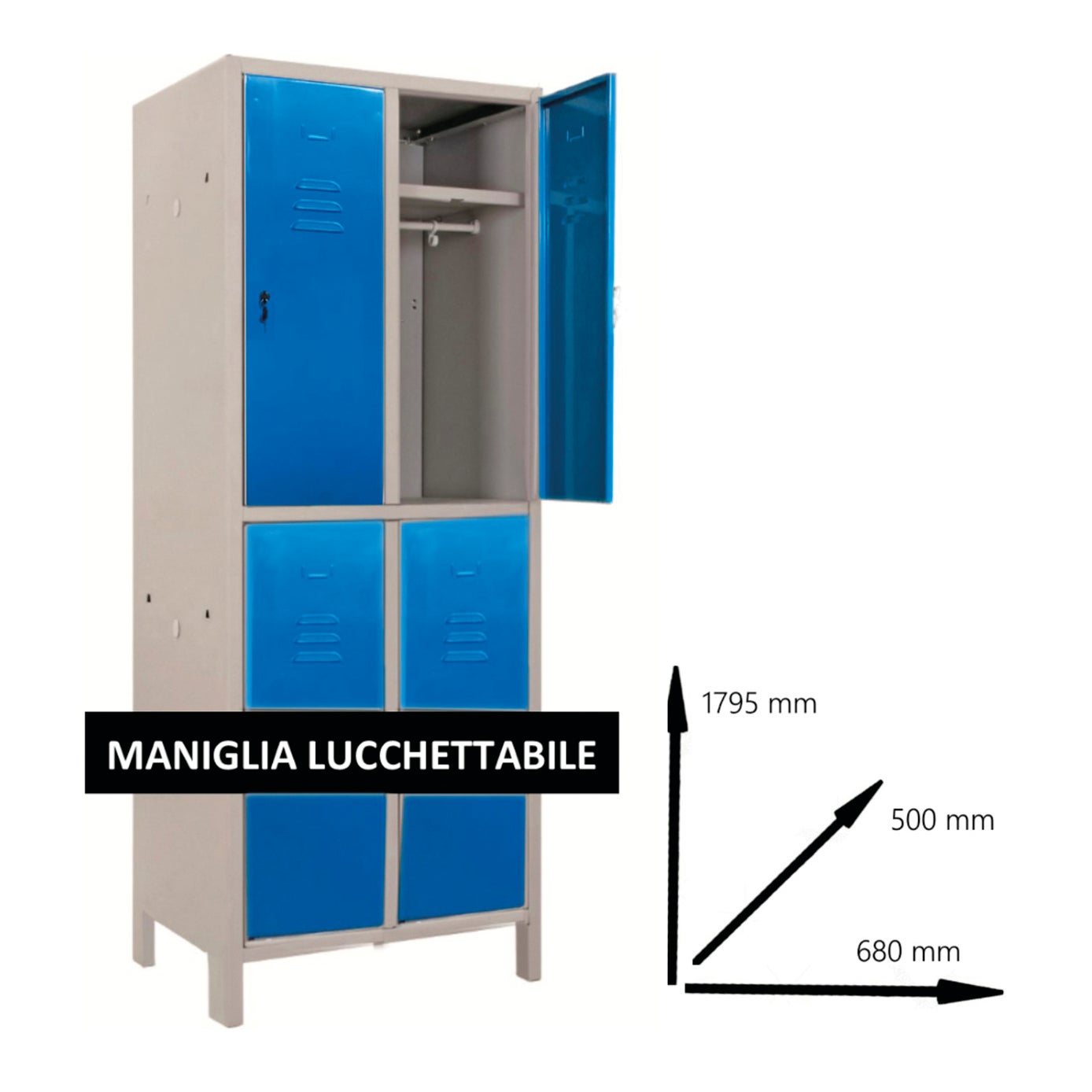 ARMADIO MONOBLOCCO MULTISPOGLIATOIO 4 POSTI ASSEMBLATO CON APPENDIABITI, RIPIANO INTERNO, MANIGLIA LUCCHETTABILE, FERITOIE E PORTA CARTELLINO. PORTE PERSNALIZZATE COLORE BLU RAL 5015 DA ASSEMBLARE. L680xP500xH1795mm