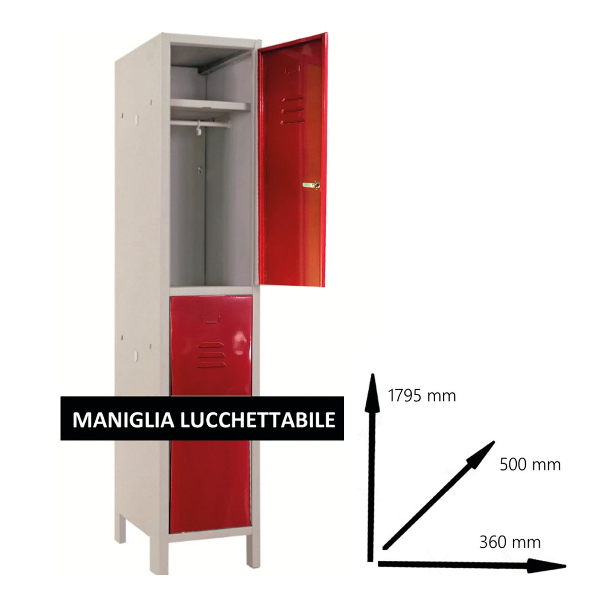 ARMADIO MONOBLOCCO MULTISPOGLIATOIO 2 POSTI ASSEMBLATO CON APPENDIABITI, RIPIANO INTERNO, MANIGLIA LUCCHETTABILE, FERITOIE E PORTA CARTELLINO. COLORE ROSSO RAL 3000 DA ASSEMBLARE. L360xP500xH1795mm