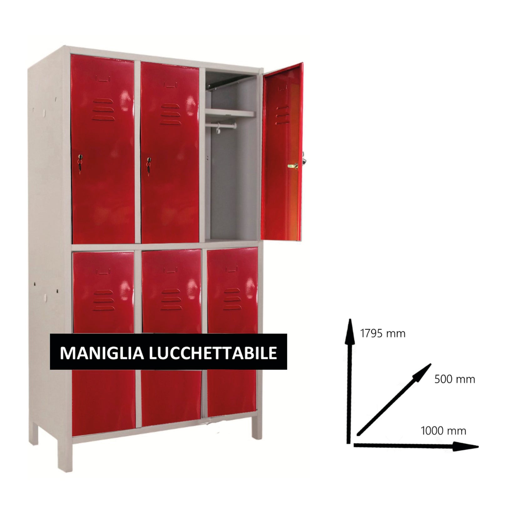 ARMADIO MONOBLOCCO MULTISPOGLIATOIO 6 POSTI ASSEMBLATO CON APPENDIABITI, RIPIANO INTERNO, MANIGLIA LUCCHETTABILE, FERITOIE E PORTA CARTELLINO. COLORE ROSSO RAL 3000 DA ASSEMBLARE. L1000xP500xH1795mm