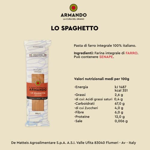 ARMANDO Lo Spaghetto, Pasta di Farro Integrale 100% Italiano, Fonte di Fibre e Altamente Digeribile - 20 confezioni da 500 gr
