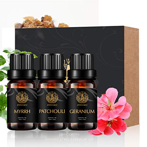 Aromaterapia mirra olio essenziale Set per diffusore, 3X10ml 100% Pure Patchouli Oil Essential Kit for umidificatore - Mirra, Patchouli, Geranio Olio Essenziale Set, Aromaterapia Geranio Oli Kit