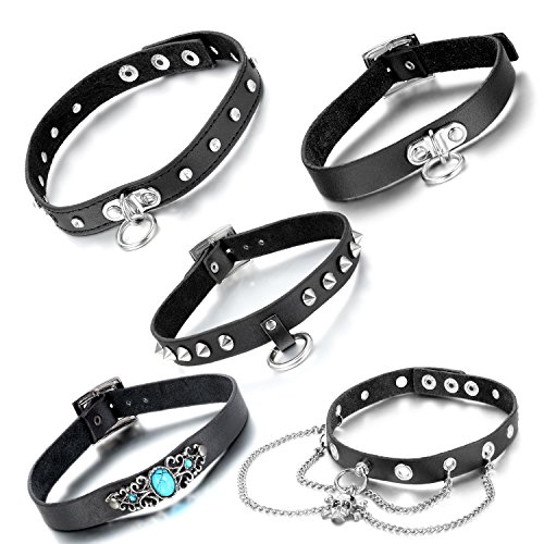 Aroncent 2/3/4/5pcs Uomo Donna Choker Punk Rock Collana Cranio Rivetti Choker Catena del Collare Regolabile Hoker Collana Croce Manette in Pelle Collana Anello Cerchio Cuore, Nero Argento