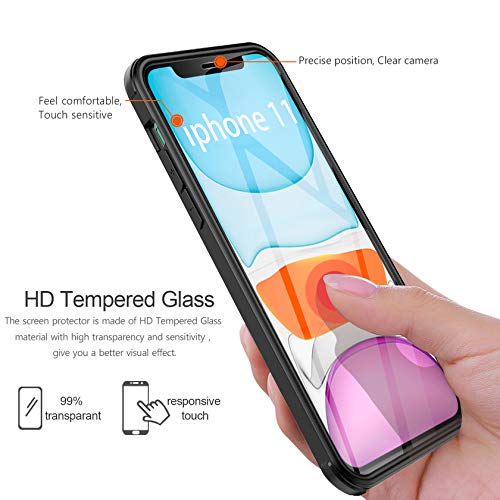 [Protezione a 360 gradi]: Appositamente progettato per iPhone 11, la cornice in vetro duro e il design a 4 angoli proteggono il telefono da urti e cadute. I bordi rialzati attorno alla telecamera impediscono di graffiare il tavolo
