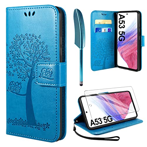 AROYI Cover Compatibile con Samsung Galaxy A53 5G e Vetro Temperato pieghevole Flip Folio PU Pelle Portafoglio Magnetica Cover Slot per schede di protezione - Blu