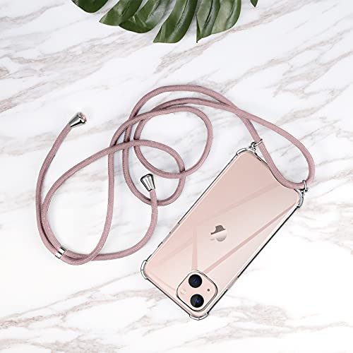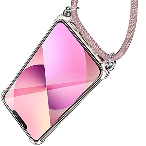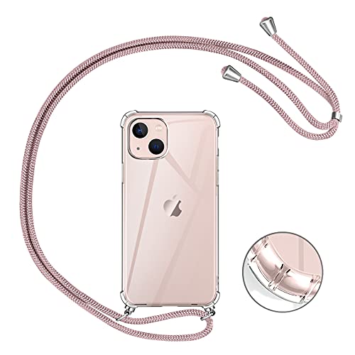 AROYI Custodia per cellulare compatibile con iPhone 13, custodia con cinturino e 2 pezzi in vetro temperato con cordino per appenderlo, custodia protettiva trasparente in silicone, colore oro rosa