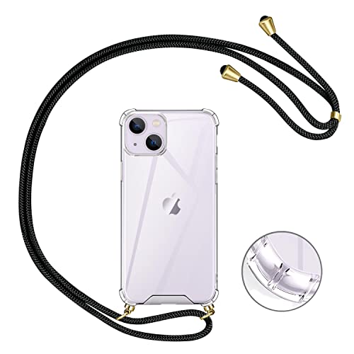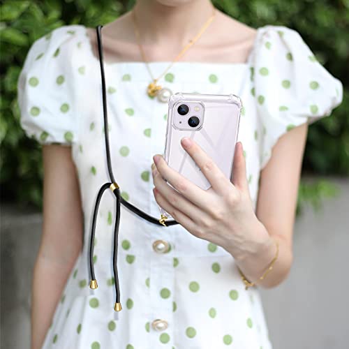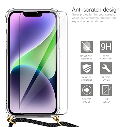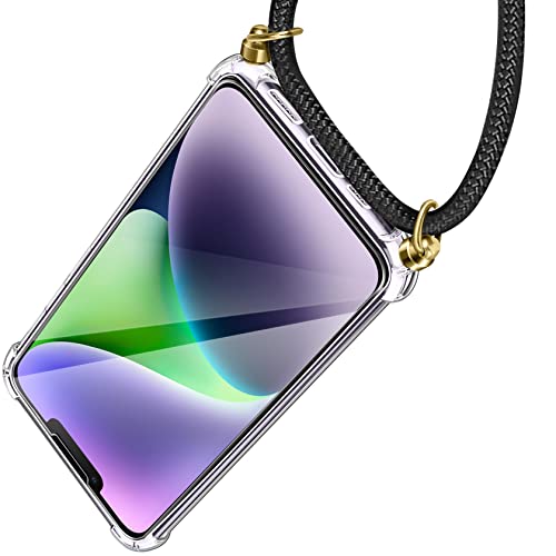 AROYI Custodia Cover Cordino Compatibile con iPhone 14 con 2 Pezzi Pellicola Protettiva in Vetro Temperato, Trasparente Custodia Ciondolo Regolabile Appendere Collana Cordino Case Cover Nero