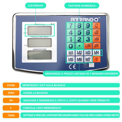 【 Tasti e Funzioni 】 Tastiera analogica numerica, M1-M7 tasti memoria, M+ aggiungi peso e prezzo in memoria, STORE memorizza peso, TARA detrarre la tara per ottenere il peso netto, C cancella, ZERO azzera peso, ADD aggiungi altro valore, accendi/spegni il display retroilluminata.