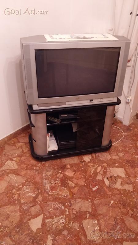 Divano a tre posti e 2 poltrone in pelle Busnelli, televisore piccolo, televisore grande 32" JVC completo di base con ruote, credenza a vetrine per soggiorno, armadio a 10 ante (riconvertibile a 2 armadi a 5 ante) per camera da letto o cameretta, appendiabiti, cassettiera a 4 cassetti per cameretta
