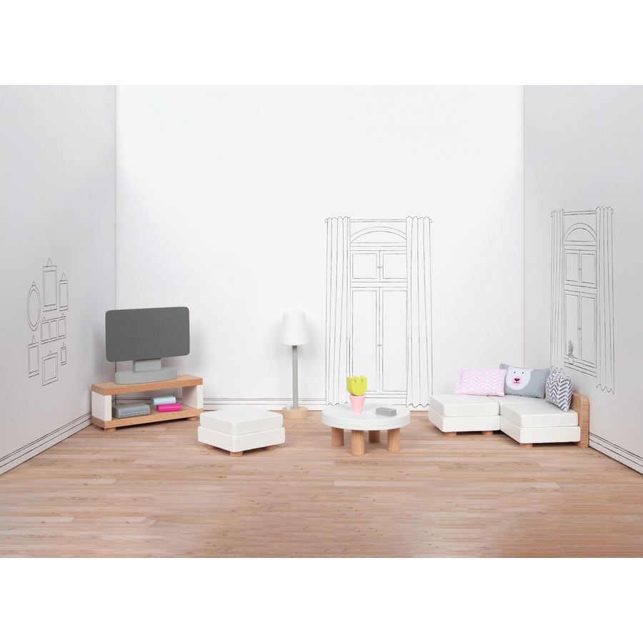 Dettagli del prodotto: Età: da 3 anni Mobili eleganti in modern em Design per il salotto della casa delle bambole Naturalmente in legno e adatto a tutte le case delle bambole goki Dimensioni e peso: Dimensioni (lunghezza x larghezza x altezza): 20,6 x 15,6 x 8,5 cm Peso: 0,44 kg Materiale e cura: Materiale: legno, tessuto La consegna include: TV, divano, tavolo da soggiorno, lampada da terra Avvertenze e istruzioni di sicurezza: Attenzione: non adatto a bambini di età inferiore a 3 anni. Pericolo di soffocamento a causa delle piccole parti.