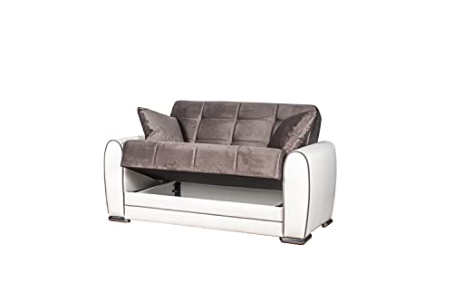 Divano letto due posti "Apollo", con struttura in ecopelle bianca e seduta in tessuto grigio, stile classico e tradizionale per un divano elegante e di classe. La seduta imbottita è estremamente confortevole, sia nella versione divano che in quella letto. Fabbricato per durare a lungo, questo divano è stato sottoposto al test di Martindale per garantirne durata e comodità