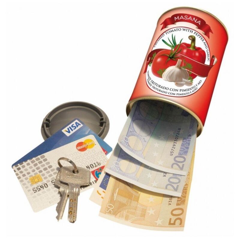 Scatola di portate in acciaio camuffata come lattina alimentare. Apertura e chiusura tramite coperchio a vite. Dimensioni: 109 x 75 mm. Passa inosservata situata nella dispensa insieme al resto dei contenitori per alimenti.