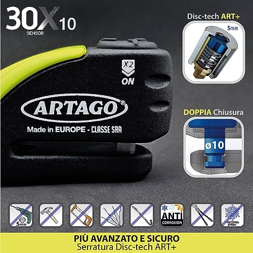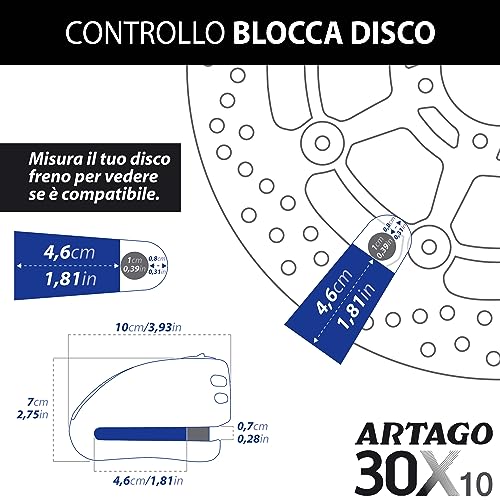 ARTAGO 30X10 Prezioso Bloccadisco Moto Allarme Don't Touch 120dB, Alta Sicurezza Omologato SRA, Doppio Bloccaggio ø10, Acciaio temprato, Antifurto Moto, Lucchetto Moto, Accessori moto