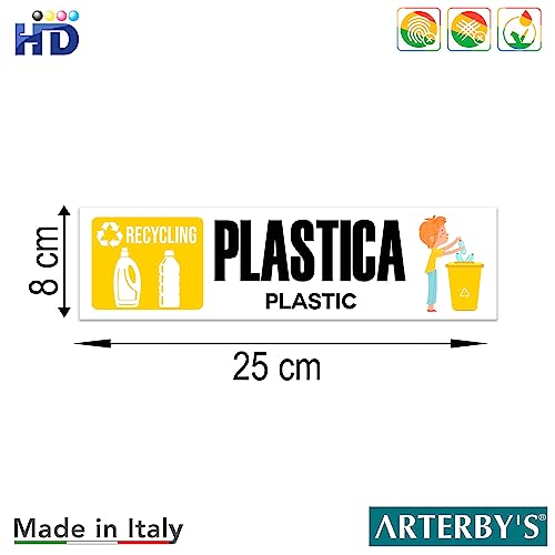 Arterby's® - Adesivi Raccolta Differenziata - Bambini Grandi Piccoli Ricliclo Rifiuti Spazzatura v6 - Impermeabili Lavabili Esterno Interno - Italiano Inglese - Conformi UNI (25x8 cm, 12 Pezzi)