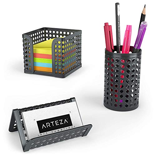 Set Accessori Scrivania da 6 pezzi: Riponi i tuoi articoli di cancelleria ufficio o tutto ciò che ti sia utile al fine di riordinare, in questo set nero, elegante e alla moda. La maggior parte dei set di accessori da scrivania a mala pena arrivano ad un massimo di 5 pezzi, ma questo set Arteza ne ha ben 6, tra cui: (1) porta penne per scrivania, (1) portalettere da scrivania, (1) vaschette portadocumenti, (1) portariviste, (1) porta biglietti da visita, e (1) porta block notes adesivi.