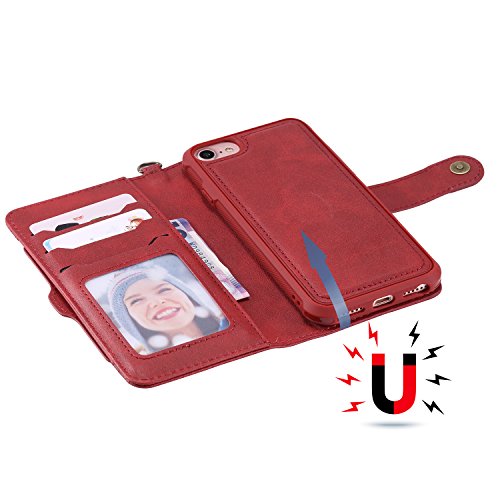 Artfeel iPhone 7/iPhone 8 Portafoglio Custodia,Staccabile 2 in 1 Copertura Magnetica con Slot per Carte,Retro Flip Pelle Custodia Stile Libro con Kickstand Cinturino Cover,Rosso