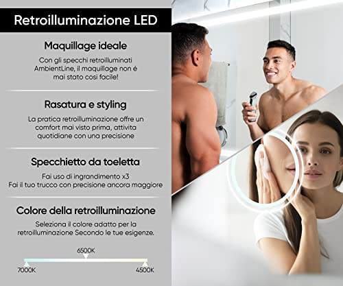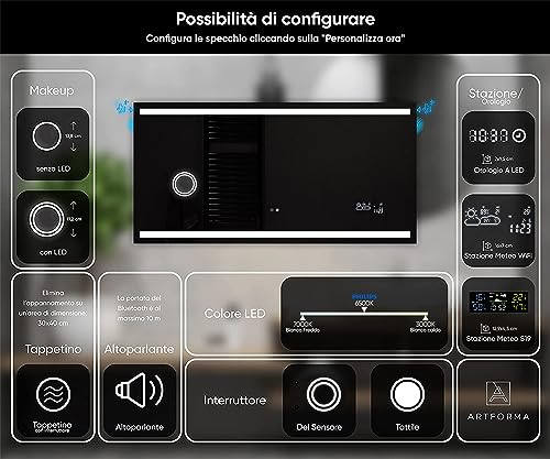 ✅ADOTTATE IL VOSTRO SPECCHIO - Vi offriamo opportunità di creare une combinazione irrepetibile che soddisfa le Vostre preferenze Grazie ad una opzione innovativa di adattazione potete scegliere dimensioni, colore di LED, tipo di interruttore, schermo meteo ed persino un altoparlante Bluetooth!