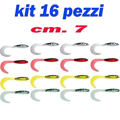 kit 16 saltarello trota artificiale in gomma siliconica consigliato per la pesca a recupero innescato su testina piombata o lanciato con bombarda, comunque sempre nella pesca a recupero,sia in lago o fiume per trote lucci cavedani aspi black bass e persici reali,che in mare nella piccola traina o da riva per tutti i predatori. confezione pz. 16 colori assortiti come da foto cm. 7