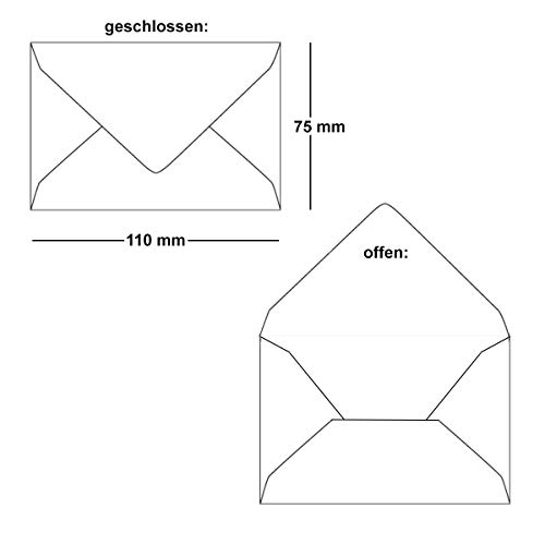 Formato: DIN C7 - Dimensioni 110 x 75 mm, grammatura: 100 g/m², incollaggio a umido, senza finestra.